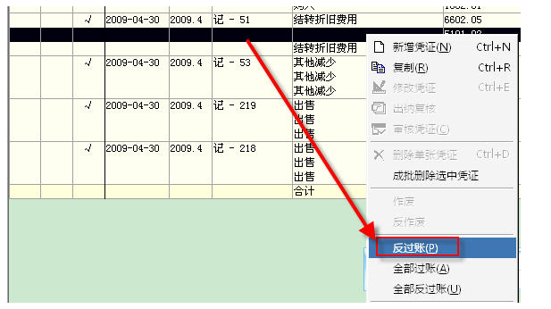 确定后,即可将所有通过固定资产系统生成的凭证查询出来,选中已经生成的计提折旧凭证,通过右键-反过账功能,对此凭证进行取消过账处理: