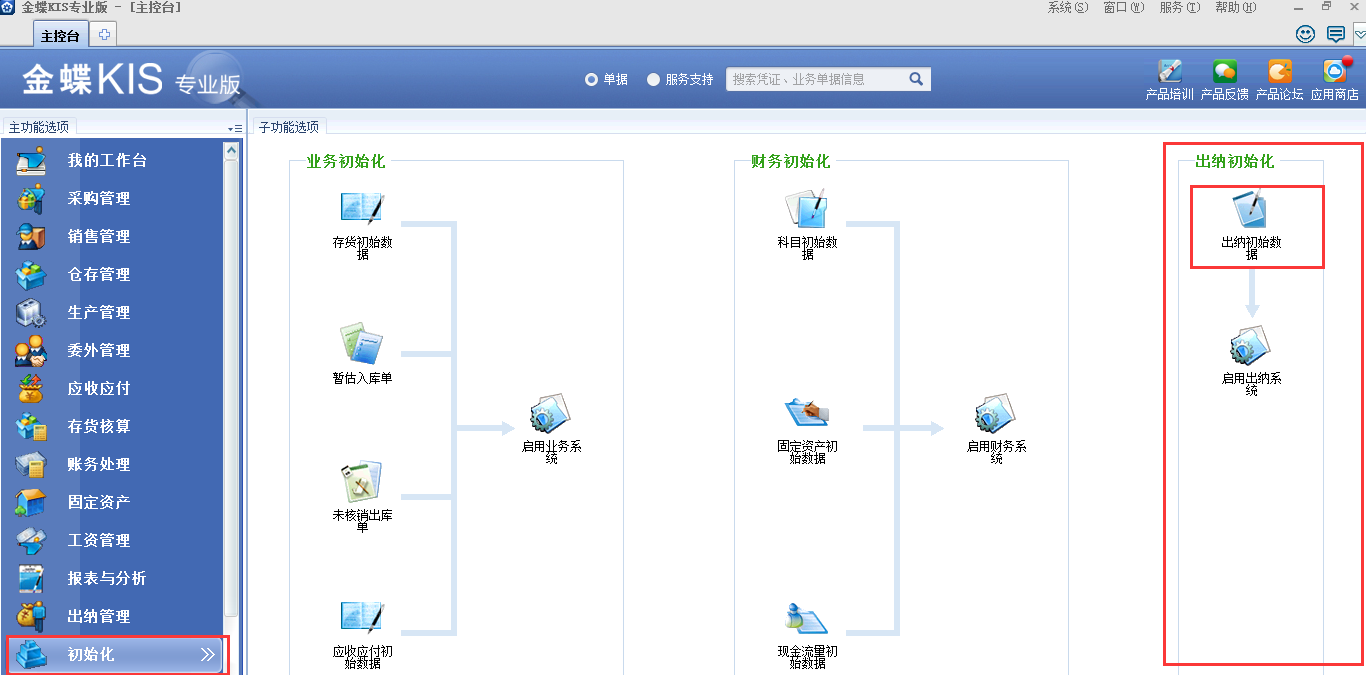 4)设置完基础设置,打开左下角初始化,选择右边出纳初始化,如下图: